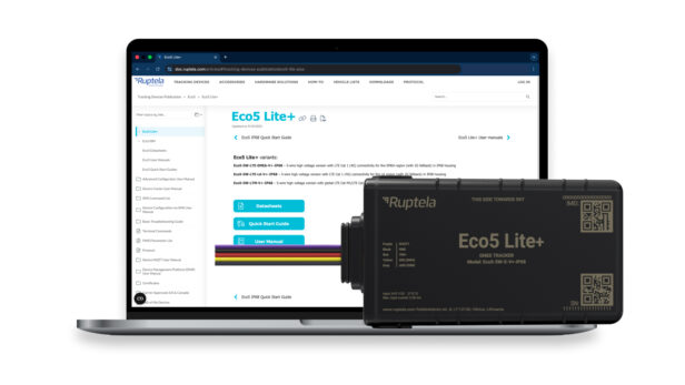 Encontre tudo o que você precisa para aproveitar ao máximo o Eco5 Lite+ e outros dispositivos GPS da Ruptela em doc.ruptela.com. Acesse fichas técnicas detalhadas, guias de início rápido, manuais completos e as versões mais recentes de firmware.